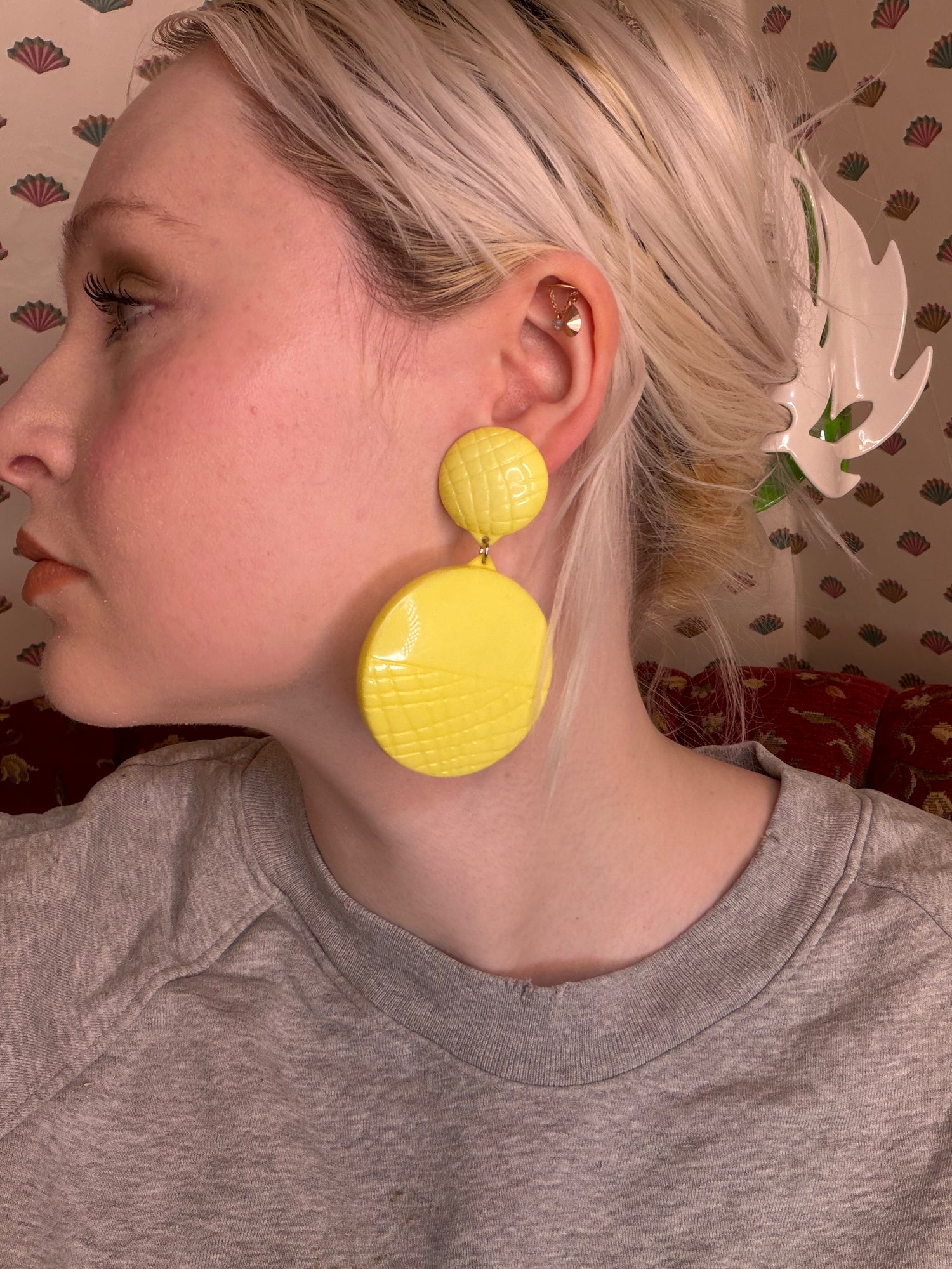 These chunky, deliciously quilted Vintage Huge Quilted Circles Clip On Earrings make a statement at nearly four inches tall. In perfectly off-kilter butter yellow, they have an iconic vintage look and great movement with a gorgeous, sculptural shape that's hard to find. Authentically vintage and totally original - easy to incorporate into any everyday look.