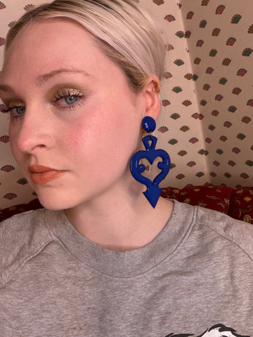 Deep, royal purple and expressly one-of-a-kind, these Vintage Huge Devil's Tail Heart Earrings measure at nearly four inches tall. Combining the shape of a heart and devil's tail, they're incredibly unique and iconic to the 1980s maximalist aesthetic--and pure camp! These lightweight clip ons have great movement.