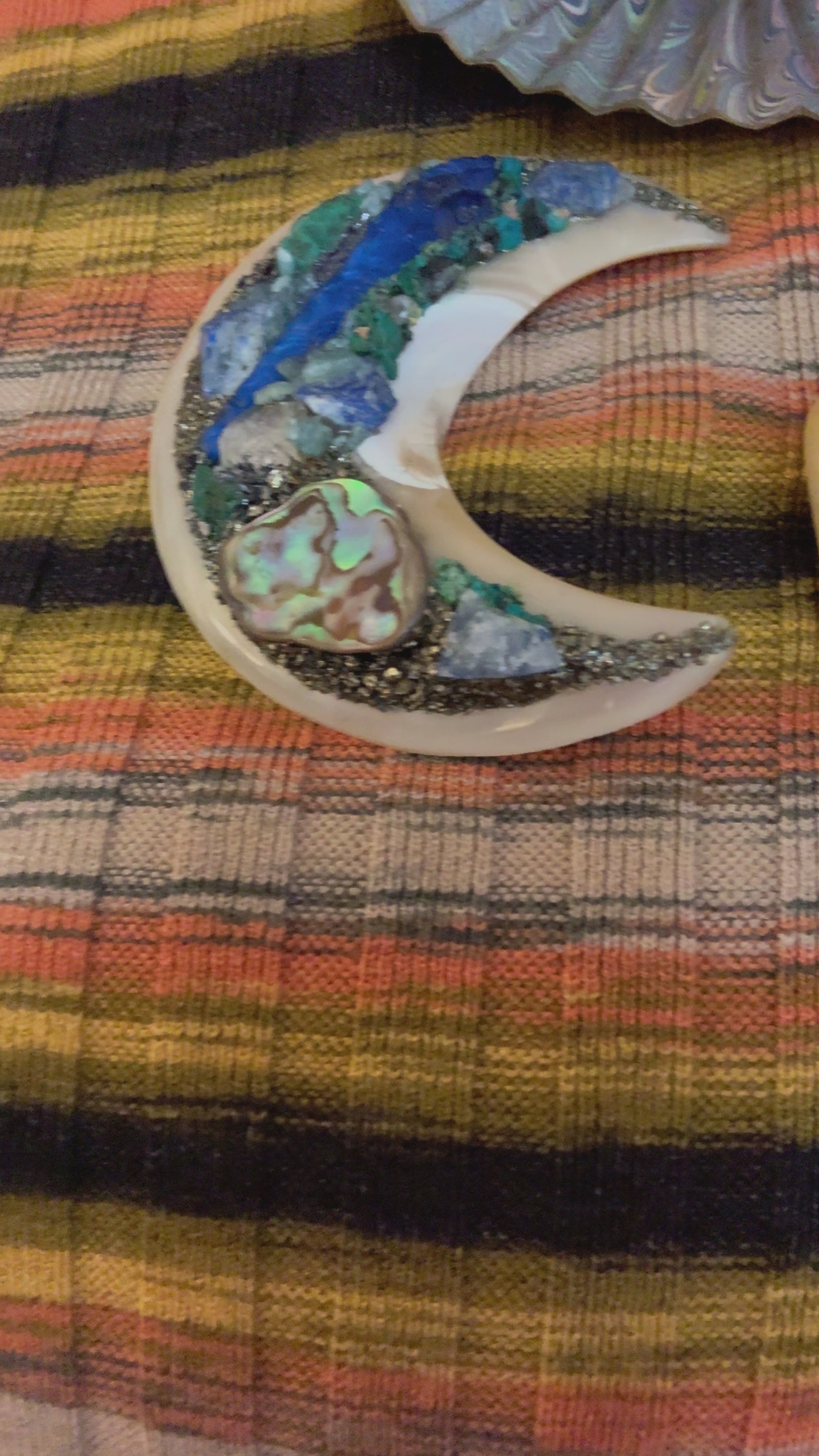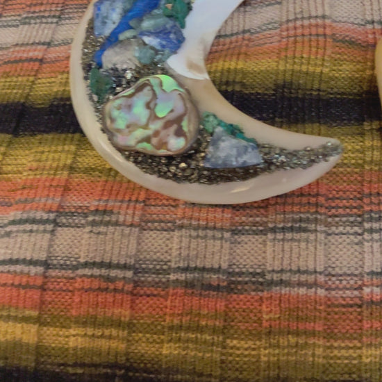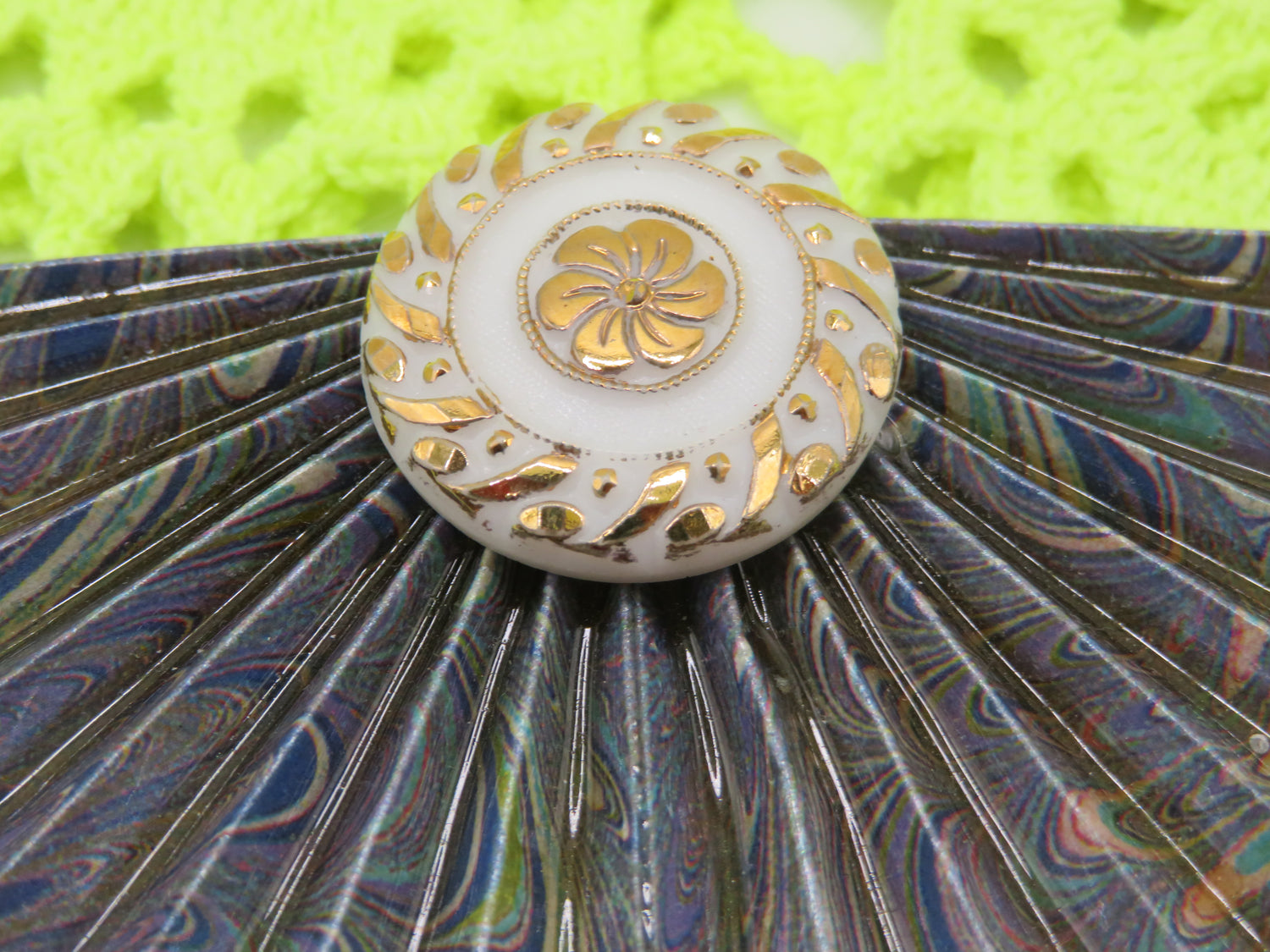 The ultimate statement-making brooch to pop onto a sweater or blazer. This Vintage Huge Metallic Retro Fan Brooch is covered in swirls of peacock print with a shiny white center decked in gold tone detail. Measuring at 4 inches wide, it's the perfect maximalist vintage brooch for collectors or anyone new to the world of wearing brooches.