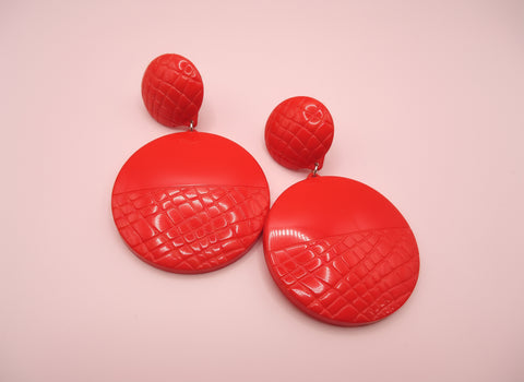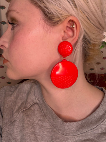 These chunky, deliciously quilted Vintage Huge Quilted Circles Clip On Earrings make a statement at nearly four inches tall. In bright cherry red, they have an iconic vintage look and great movement with a gorgeous, sculptural shape that's hard to find. Authentically vintage and totally original - easy to incorporate into any everyday look.