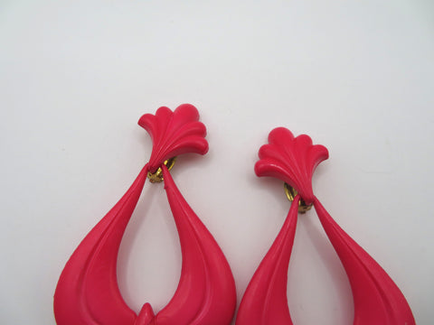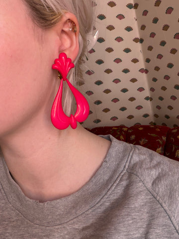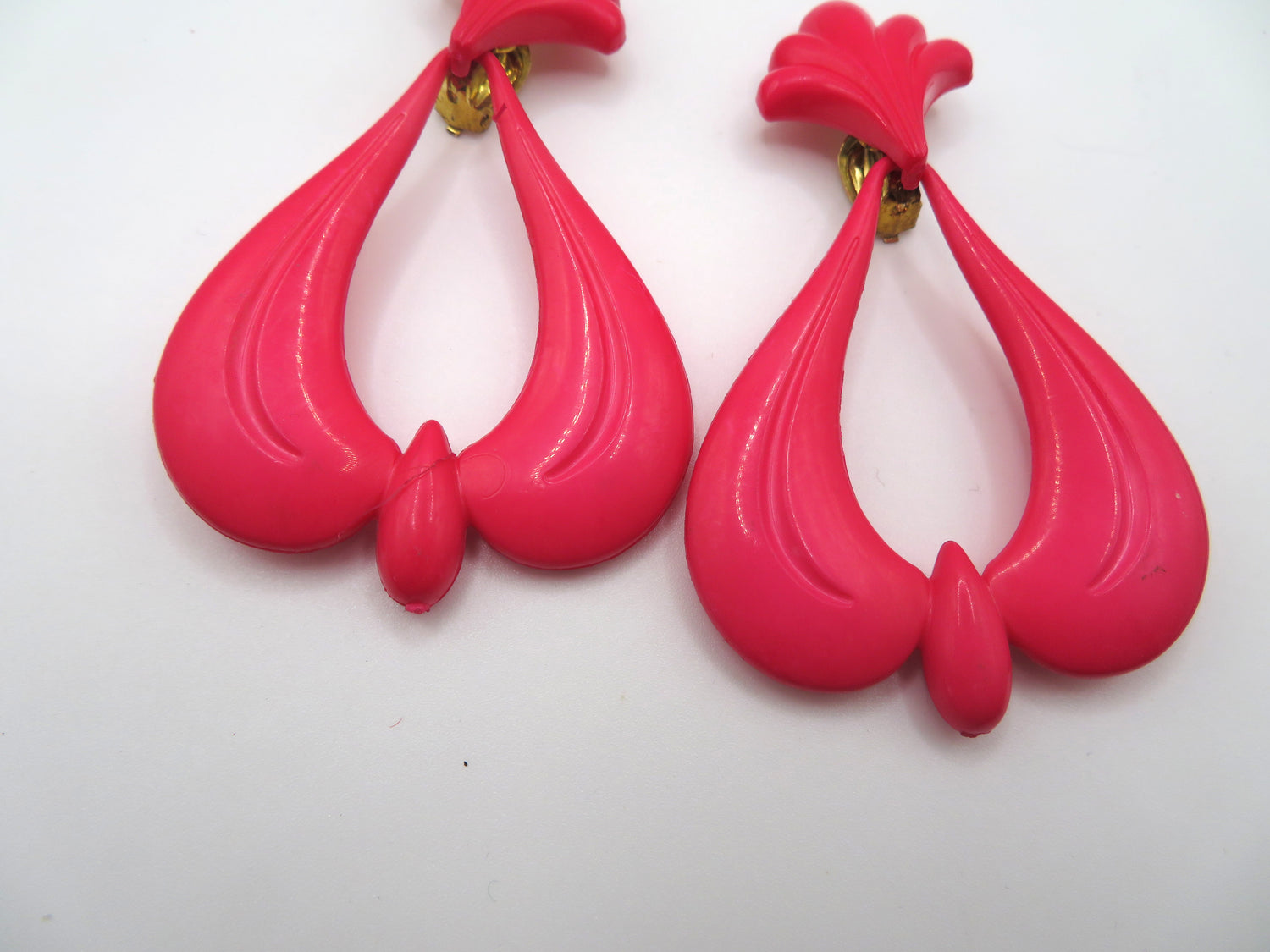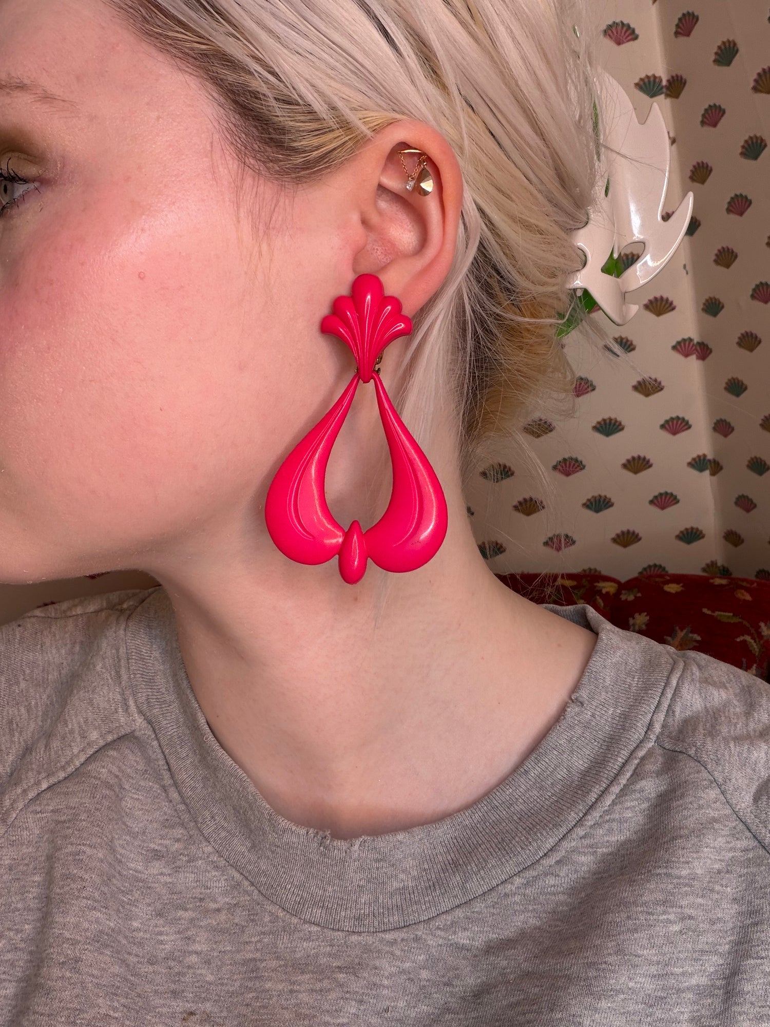 In the most delicious vivid, hot pink hue, these Vintage Huge Rococo Earrings have shell motifs, scrollwork and soft art nouveau inspired shapes. Measuring at roughly three inches tall, they are quite the statement and bring a rare colorful touch to authentically vintage, oversized earrings. Lightweight clip ons are easy to wear.