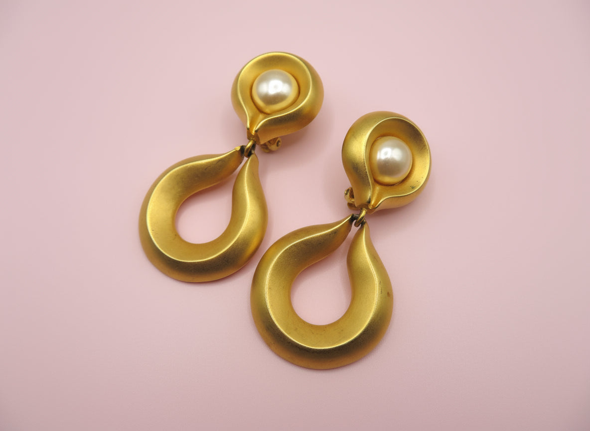 These iconic Vintage Karl Lagerfeld Pearl Drop Clip On Earrings have a luxurious, classic feel. Very Chanel and very 1990s French fashion. Beautiful gold tone with a pretty pearl in the center. Perfect as an everyday essential or chunky night out look.