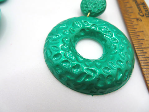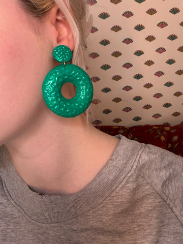 Meet the chunkiest, brightest Vintage Metallic Kelly Green Hoop Clip On Earrings with the most perfect spotted texture. This rare find has that iconic front-facing hoop look so synonymous with vintage style. Lightweight and easy to wear; makes a major, instant statement.