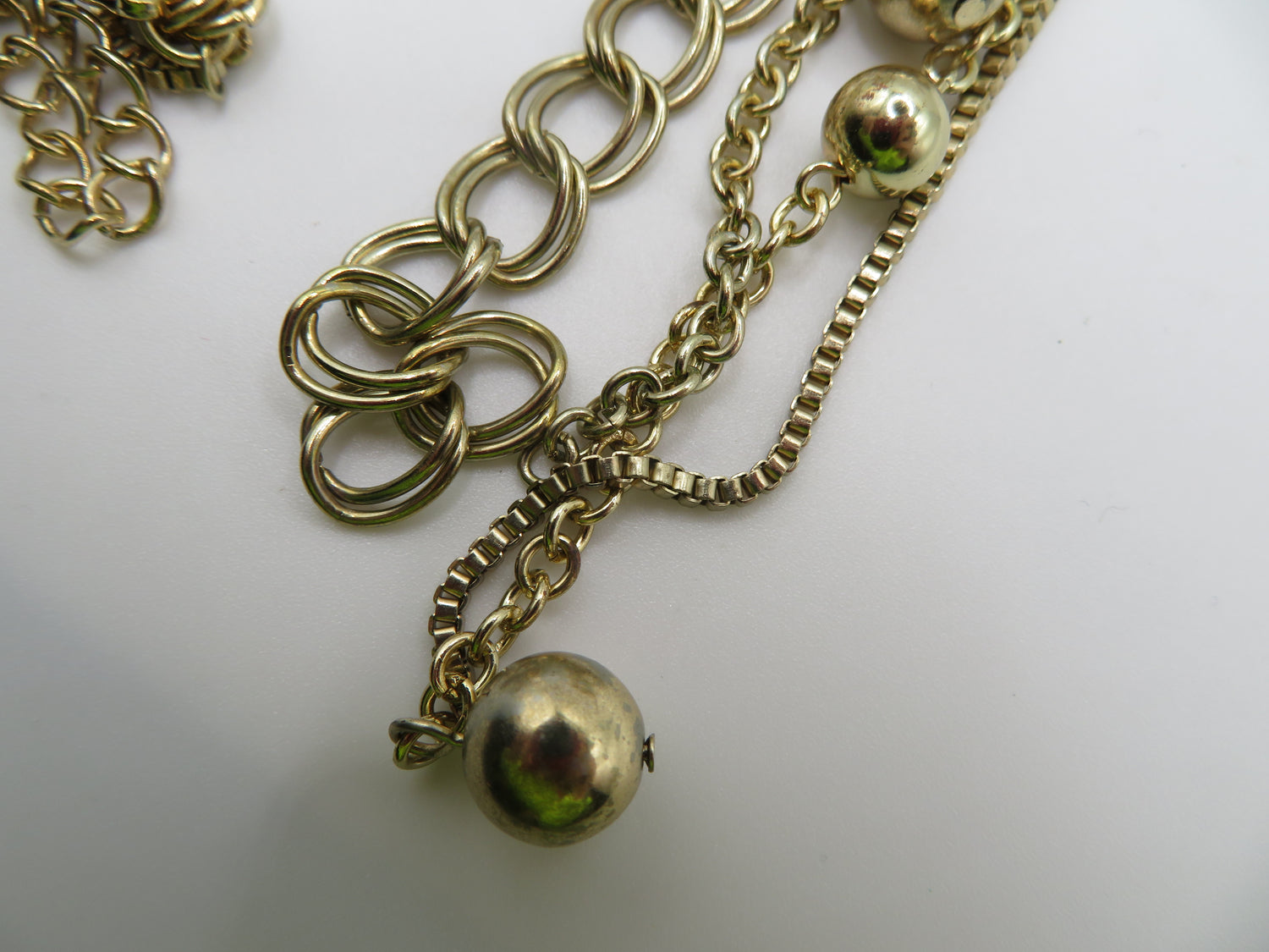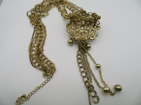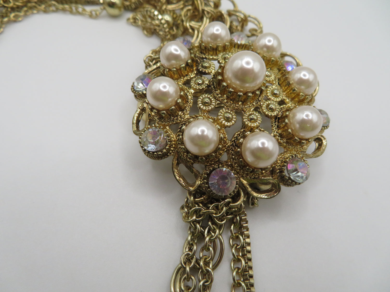 This dreamy Vintage Mystical Pearl Crystal Pendant Necklace is such a statement. Multiple gold tone strands of different sizes join together and surround a chunky pearl covered pendant with shiny rhinestones. Consider her a mystical talisman for everyday style.
