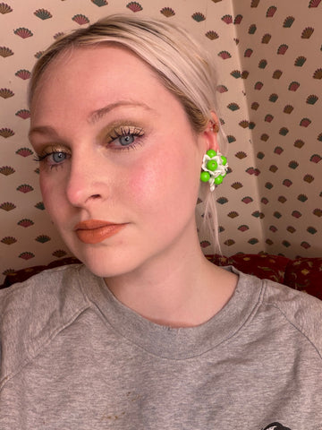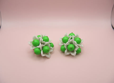 The most perfect little unique floral button earrings are getting harder and harder to find. These Vintage Neon Flower Beaded Button Style West Germany Clip On Earrings come in a supreme shade of lime green beads surrounded by little white leaf-like beads. Lightweight clip ons are easy to wear.
