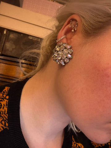 A stunning set authentically straight from the midcentury era. This Vintage Sparkling Midcentury Domed Rhinestone Brooch & Earrings Set can be worn together or on its own. Nice chunky, hard-to-find domed style.