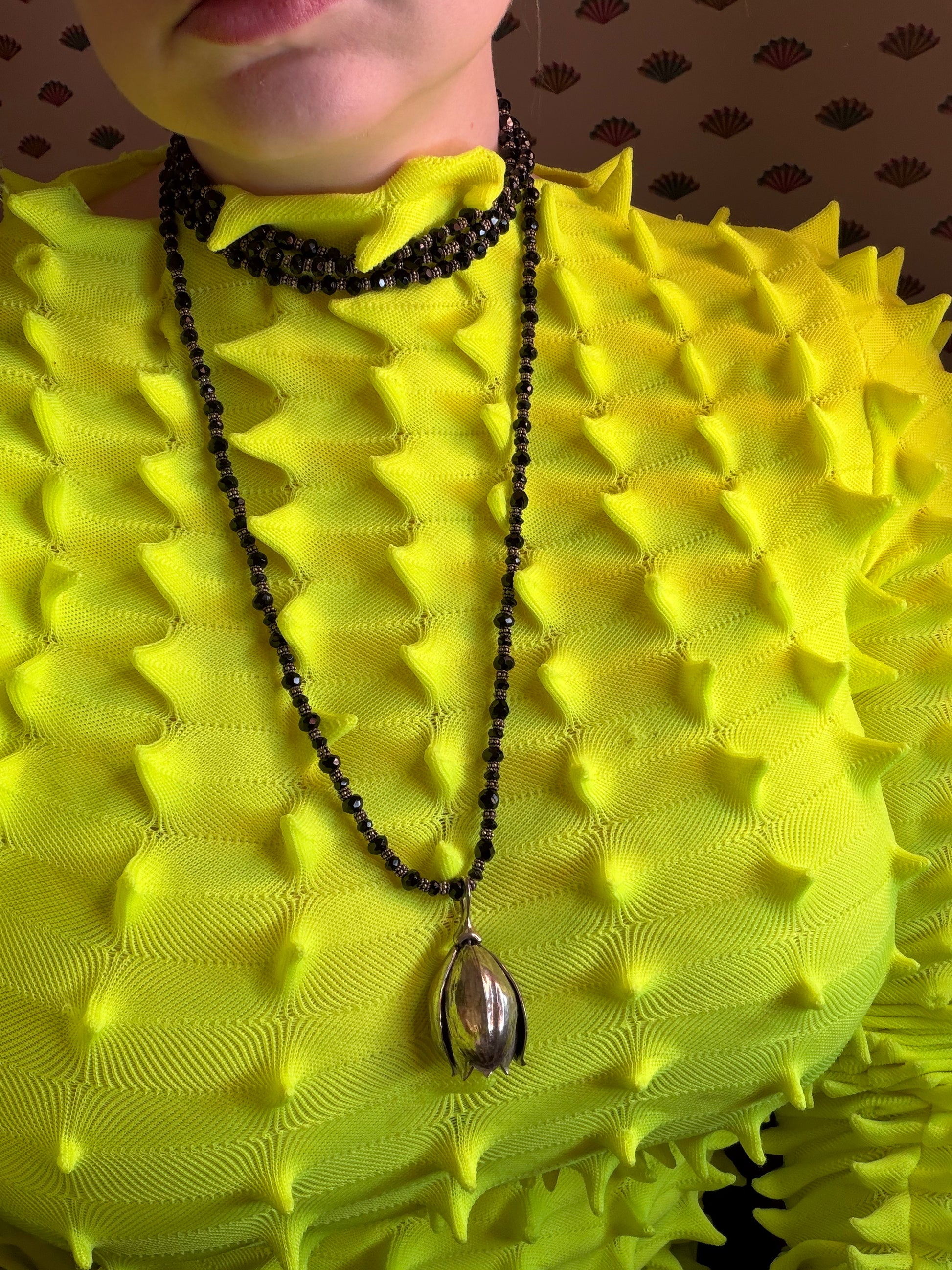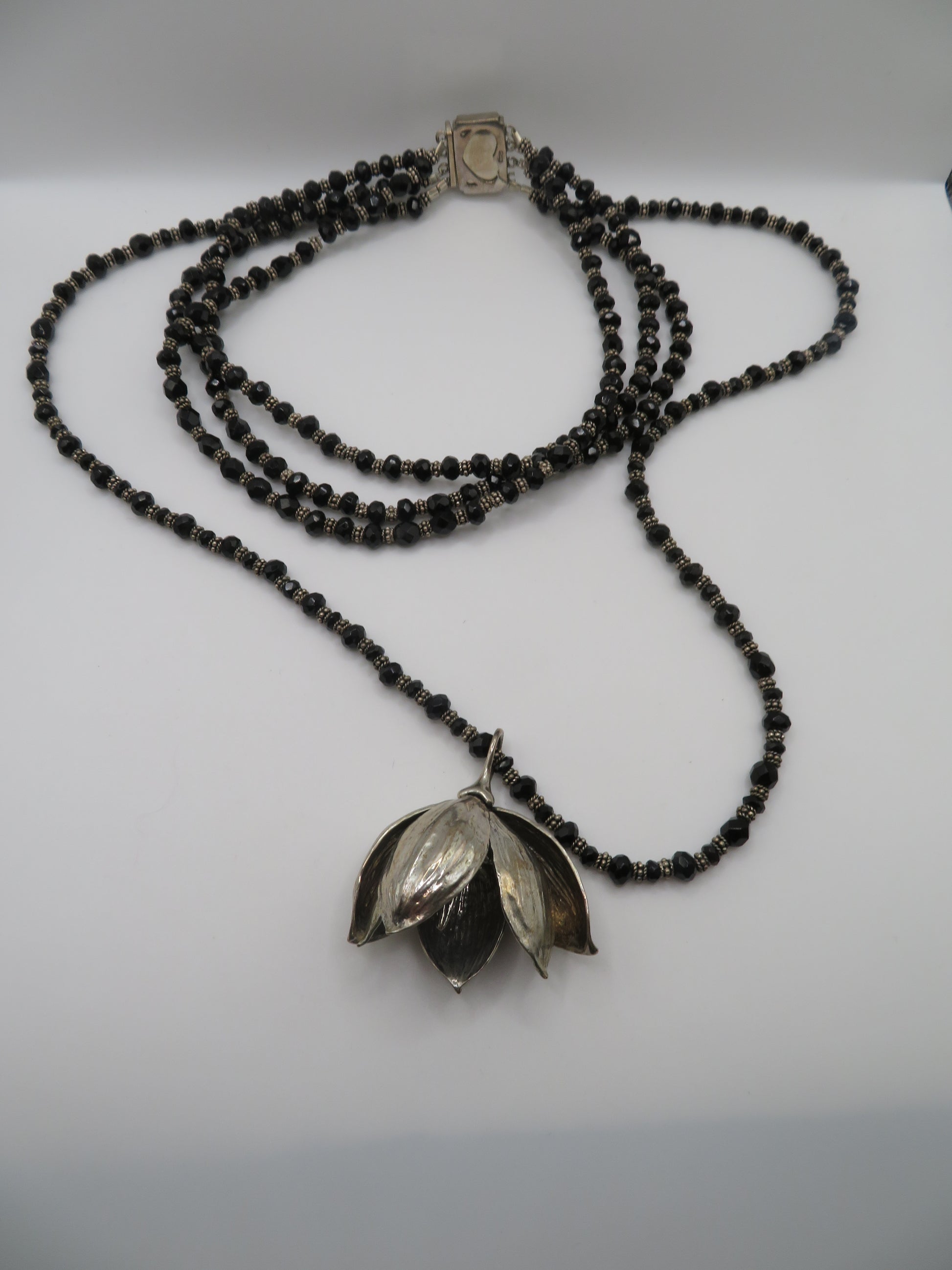 We've never seen anything quite like this incredibly unique Vintage Sterling Silver Gothic Black Beaded Flower Choker Necklace. Made of carved black glass beads and solid sterling silver beads, the choker portion sits comfortably around the neck while the longer strand hangs low and suspends a super heavy, very thick articulated sterling silver flower that opens slightly as it moves. Every detail was thought out in this piece; even the clasp is covered in pretty marcasite with a heart. It would also make an exceptionally unique gift.