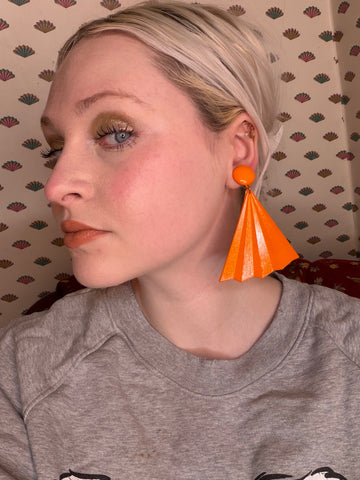 These Vintage Tangerine Huge Fan Clip On Earrings are so monumental. They take up ample space and are perfectly impactful and lightweight. Such an iconic shape that's bound to bring you constant compliments.