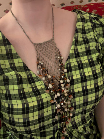 This Vintage Woven Shell & Rose Quartz Fringe Statement Necklace is a huge statement and a rare, unexpectedly long bohemian chic moment. Its woven centerpiece is decked with dripping shells, rose quartz, carnelian and abalone, all of which gives a mystical magical maximalist mermaid vibe. Super unique piece.